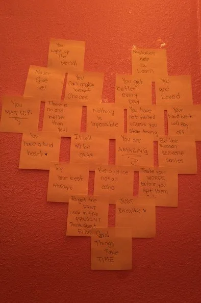 Notes written by 18-year-old Elida Mejia Elias to herself, plastered on her bedroom wall in the shape of a heart. ( Zaydee Sanchez)